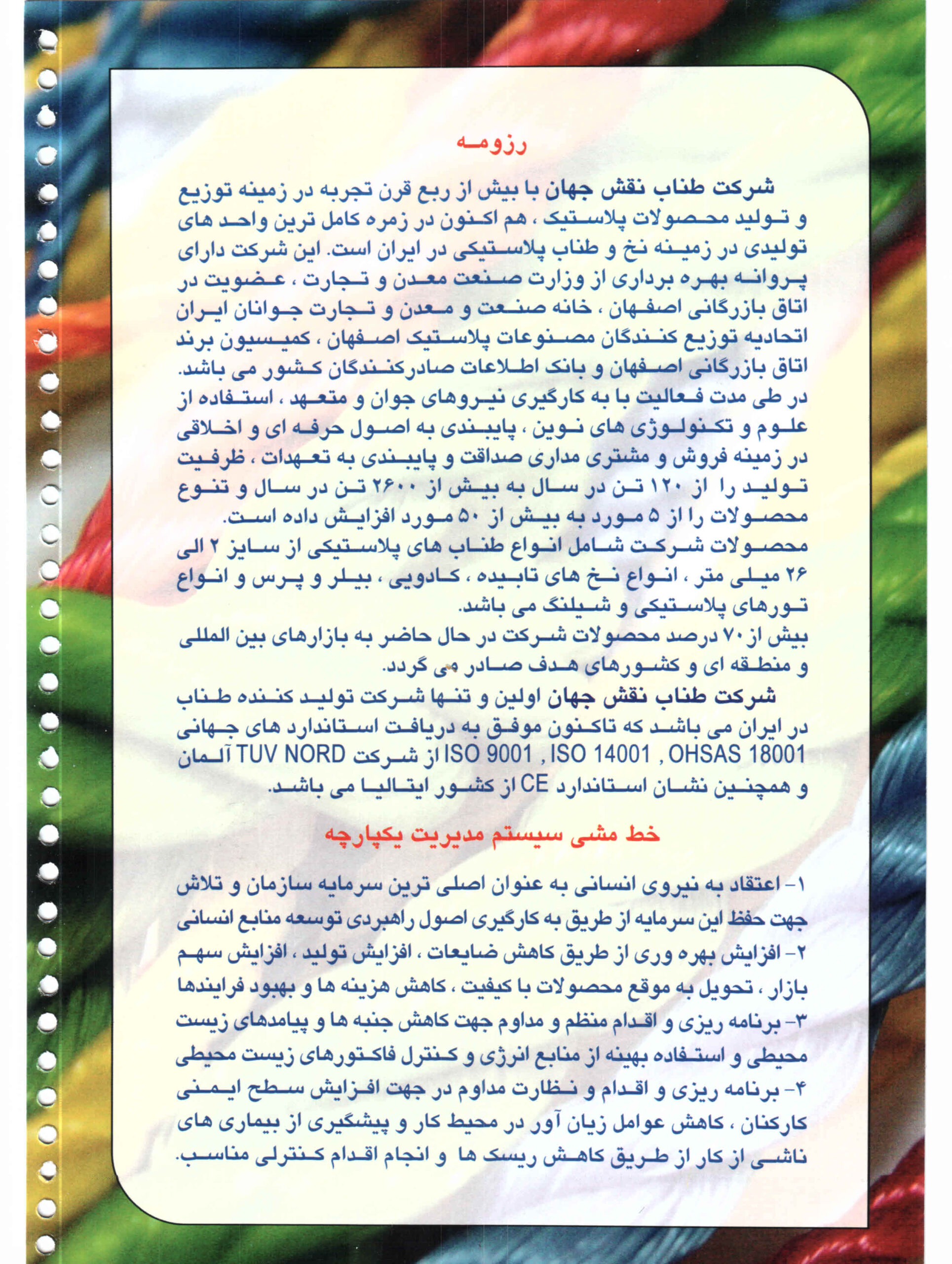 شرکت طناب نقشجهان سپاهان با بیش از دو دهه سابقه فعالیت از سال ۱۳۷۹ شروع به فعالیت کرده است. آقای دکتر مسعود جمالی که در ردیف ۵ کارآفرین برتر آسیا و اقیانوسیه قرار گرفته، بااراده و پشتکار خود و پرسنل توانمند این مجموعه توانستهاند با بهرهگیری از علوم و تکنولوژیهای نوین یکی از کاملترین واحدهای تولیدی را در زمینه تولید نخ و طناب پلاستیکی در ایران و خاورمیانه با بیش از ۵۰ مدل محصول متنوع بنیانگذاری نمایند.